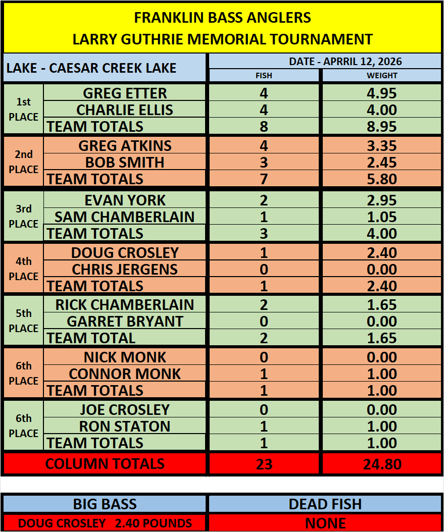 2026 FRANKLIN BASS ANGLERS TOURNAMENT SCHEDULE