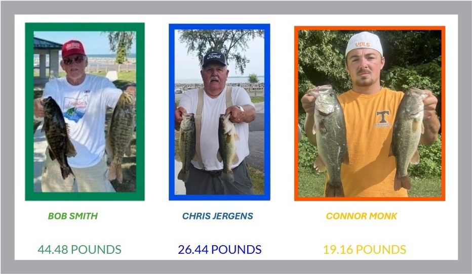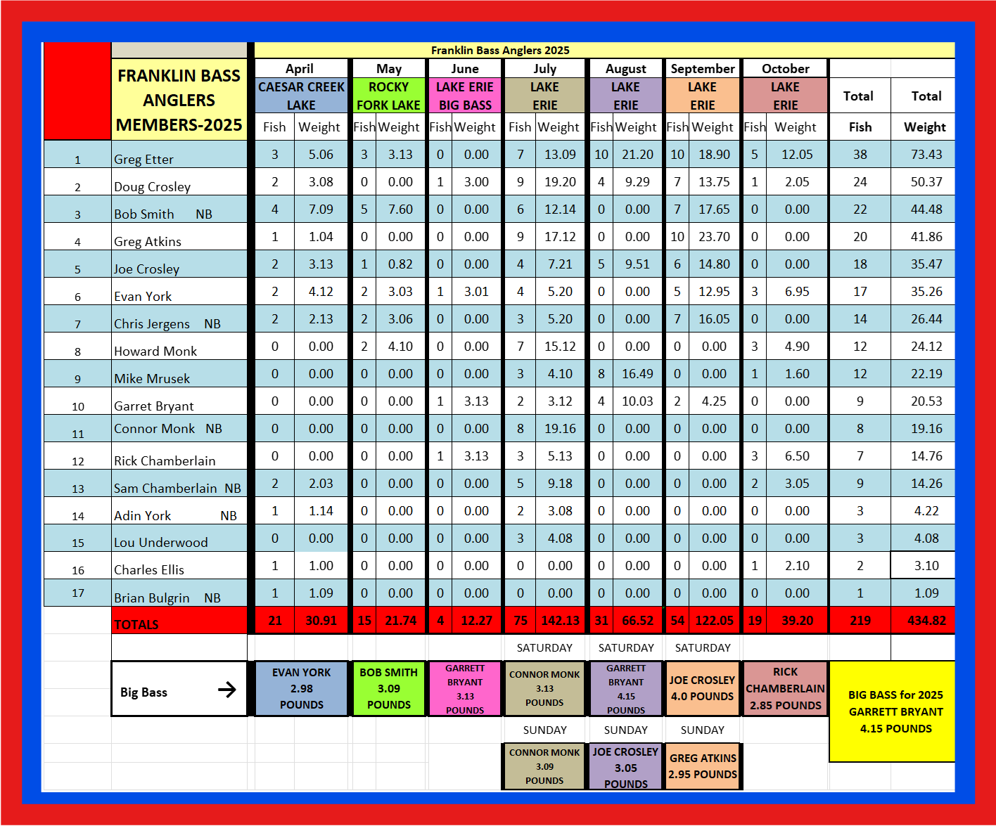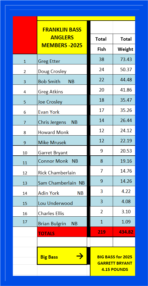 Franklin Bass Anglers 2025 Big Bass award goes to Garrett Bryant for his 4.15 pound beauty caught at Lake Erie in August. He also was tied for second biggest bass with Connor Monk and Rick Chamberlain , all caught a 3.13 bass.